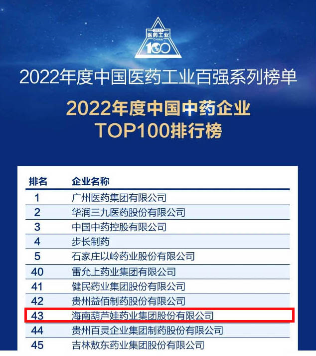 财神争霸药业集团连续4年荣登“中国中药企业TOP100排行榜”,排名上升至第43位